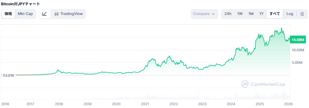 ビットコインの過去の値動きをみてみると、価格の変動を繰り返しながらも時間をかけて値上がりしてきていることがわかります。