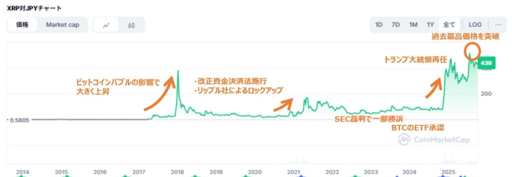 リップル(XRP)の長期チャートからは、ボラティリティの大きさと同時に、訴訟リスクを乗り越えたことによる持続的な需要への期待も読み取れます。